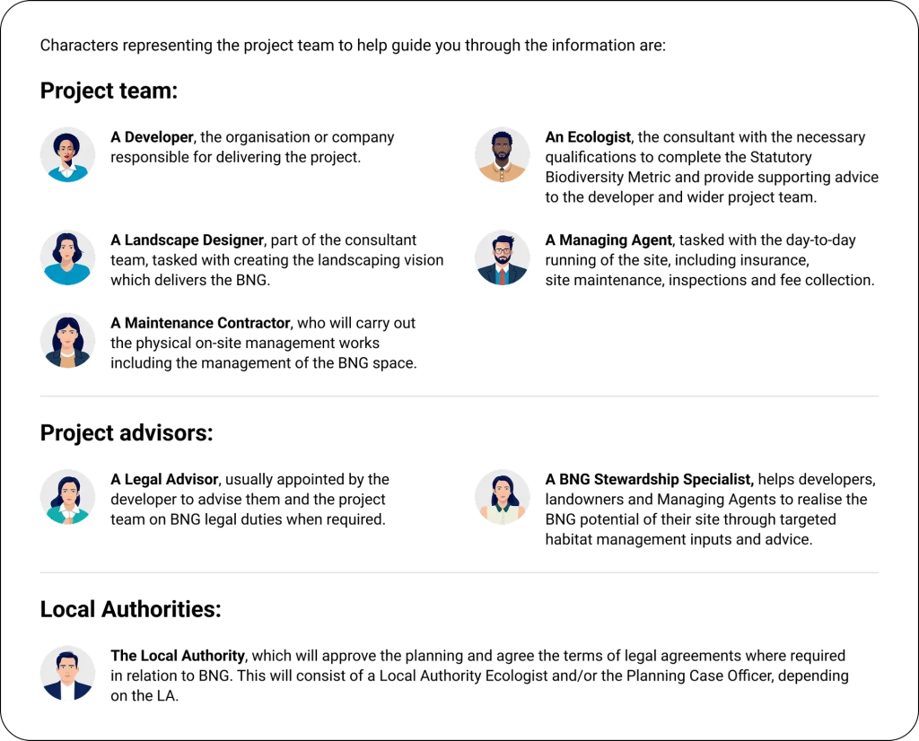 Structured on the Future Homes Hub BNG planning process flow diagram, the guidance introduces characters to provide a practical, scenario-based understanding of good practice at each stage of the process.